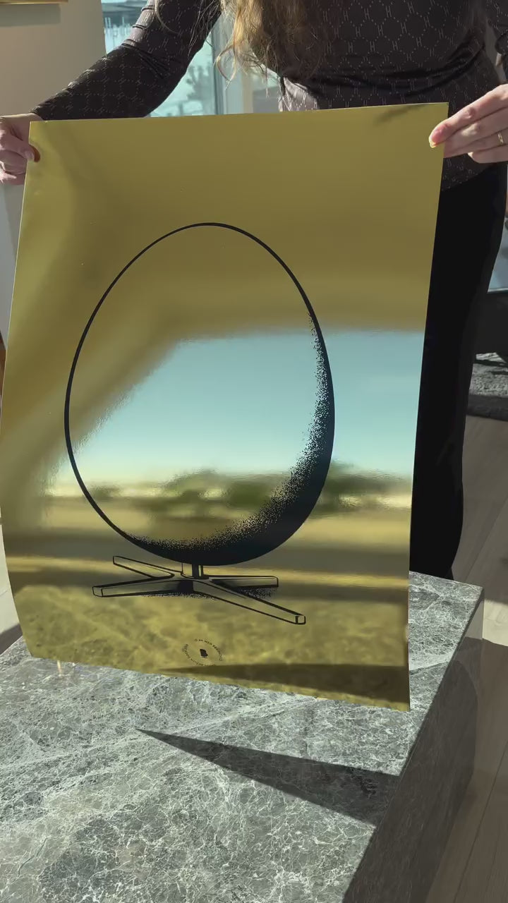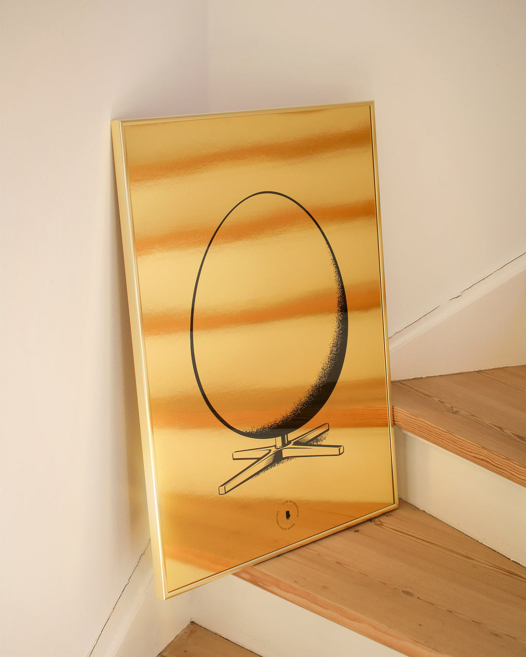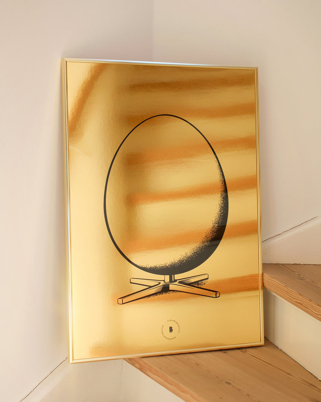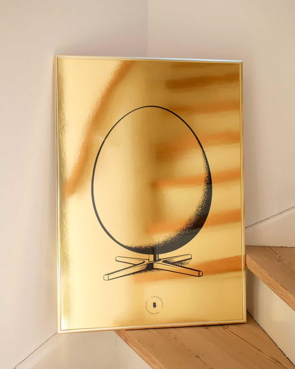 I anledning af vores 10-års jubilæum har vi designet denne eksklusive plakat med guldægget, som kun findes i 50 eksemplarer. Guldægget er en bogstavelig fortolkning af Arne Jacobsens lænestol, Ægget, der blev designet i 1958.