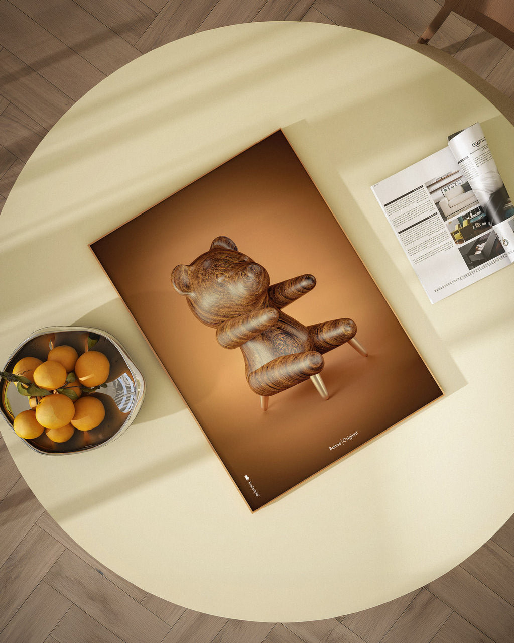 Brainchild plakat med motivet Bamse Figuren i klassisk stil på en brun baggrund. Plakaten er en bogstavelig fortolkning af Hans J. Wegners lænestol, Bamsen, som blev designet i 1951. Bamsens bløde form spreder varme og glæde i din indretning. Brainchilds fortolkning af Bamsen er dansk design af højeste kvalitet, som fuldender din boligindretning.