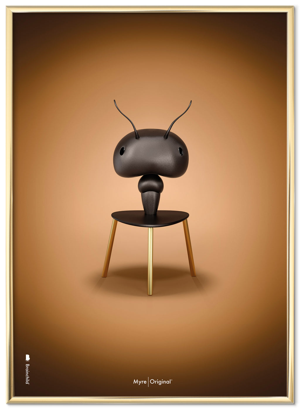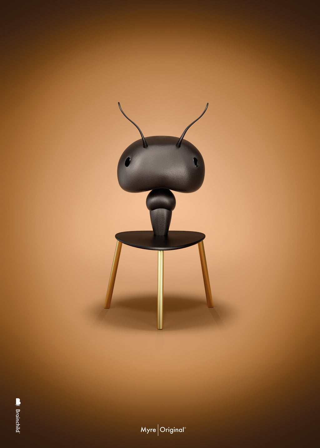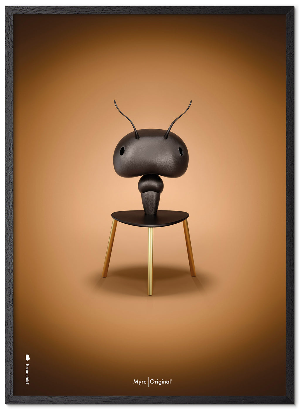 Brainchild plakat med motivet Myre i klassisk stil Myre på en brun baggrund. Plakaten er en bogstavelig fortolkning af Arne Jacobsens stol, Myren, som blev designet i 1952. Myren er det bevidste og minimalistiske valg i din indretning. Brainchilds fortolkning af Myren er dansk design af højeste kvalitet, som fuldender din boligindretning.